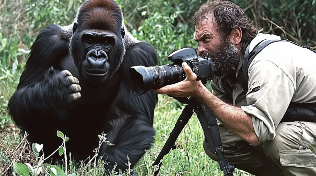 Cautiously, Paul turned his face toward the unexpected presence. His eyes widened in shock as he realized he was facing a massive female gorilla. For a moment, he could barely breathe. With shallow, rapid breaths, he grasped the seriousness of the situation and tried to weigh his options.